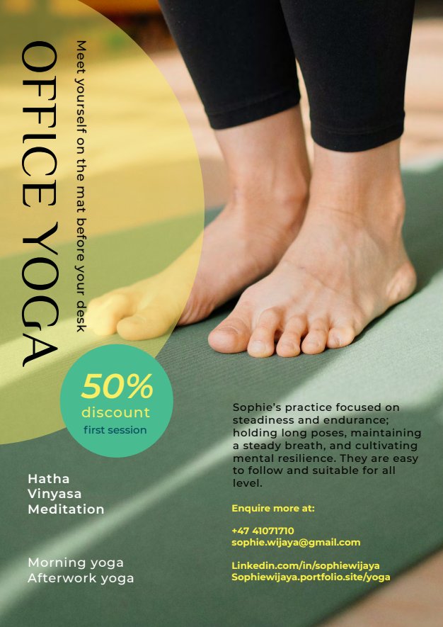 My practice is gentle, practical and down-to-earth. It focuses on developing your own familiarity with your body and breath, thereafter, your own practice. I believe that everyone can practice yoga, no matter where, for whatever duration, whatever age and outfits.